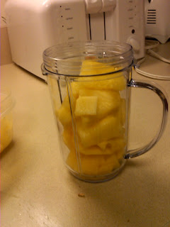 Mango-pineapple smoothie (just fresh mango, fresh pineapple, a packet of artificial sweetener, and a few ice cubes blended in my beloved Magic Bullet)